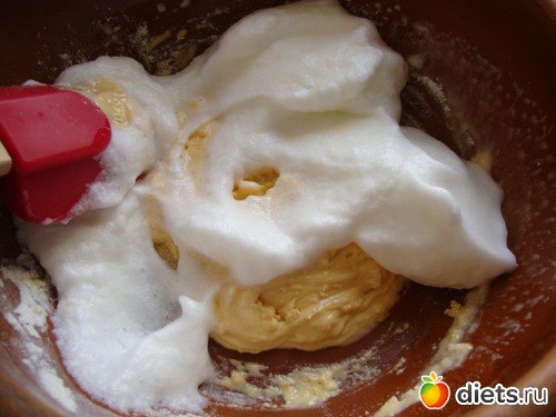 Белки взбить отдельно до мягких пиков, ввести в тесто. Аккуратно размешать.