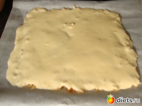 Тесто выложить на яблоки, разровнять.