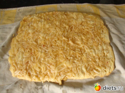 Противень поставить в разогретую духовку и выпекать до золотистого цвета около 15-20 минут. Вынуть противень, перевернуть рулет тестом вниз на чистое полотенце.