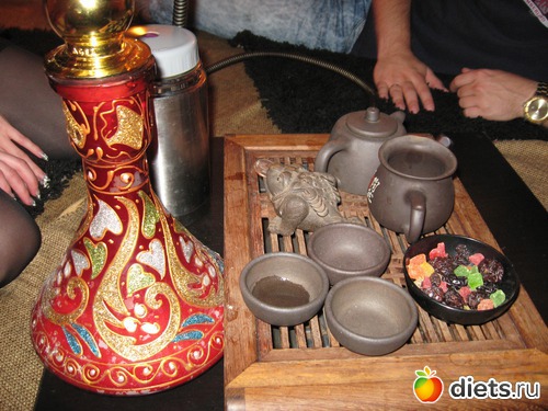 Милая девушка принесла нам поднос с чашечками, традиционной китайской лягушкой, чайником, мисочкой с чаем (мы выбрали зеленый чай - Те Гуань Инь). Сначала девушка дала нам каждому вдохнуть аромат этого восхитительного чая, сказав, что его первые ноты раскрываются от горячего дыхания. Затем она пересыпала его в глиняный чайничек и заварила кипятком из термоса, добавив при этом, что температура воды должна быть менее 100 °C, оптимально подойдет для заваривания 70 °C. Чаю дали настояться минут 7-10, за это время девушка принесла кальян на молоке с табачной смесью на фруктах.