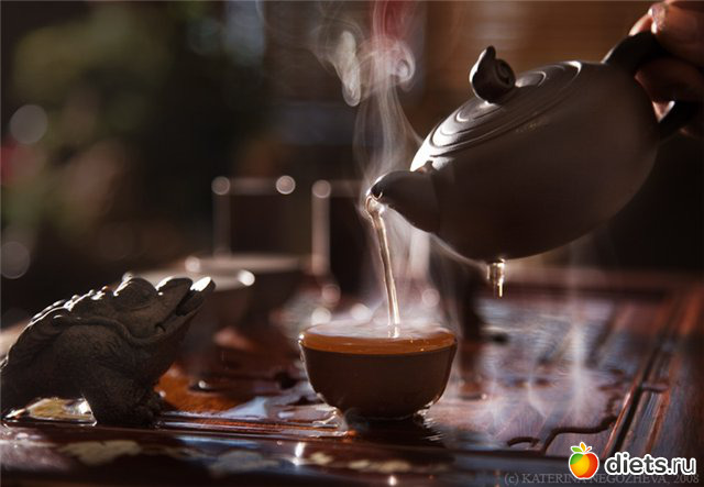 Затем девушка начала разливать чай по чашкам, высоко поднимая чайник так, что чай разбрызгивался и распространял свой аромат по всей комнате. "Чай должен играть и пузыриться", - сказала она. Девушка полила чай на трехногую лягушку, приглашая ее к церемонии. По традиции, это сулило достаток и материальное благополучие всей семье.