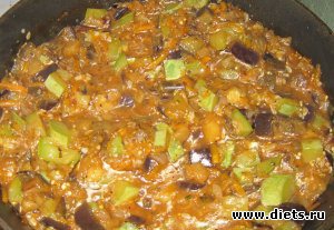 2. Баклажаны и кабачки порезать кубиками, морковь потереть на крупной терке, лук кубиками. Все сложить в сковородку и обжарить на растительном масле в течение 15 минут. В процессе посолить.
