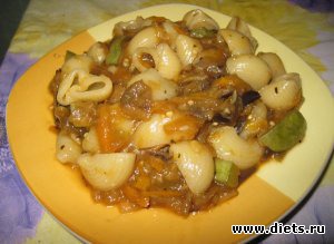 4. К овощам добавить вареные макароны, перемешать. Блюдо готово