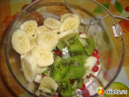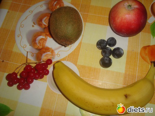 Значит, калина веточка, виноград несколько ягод, банан один, одно яблоко и киви!+йогурт!