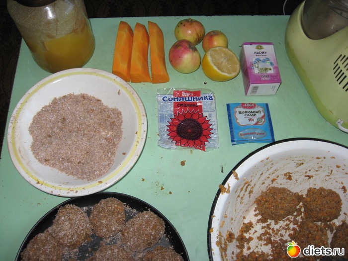 Перебила кусок тыквы и 2 яблока на комбайне, добавила перемолотую овсяную крупу и семена льна, вместо сахара использовала порошок стевии ( сладкая трава).