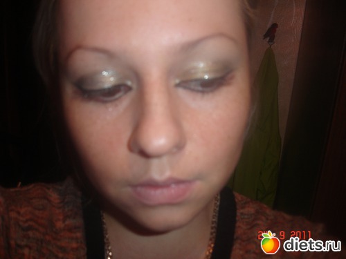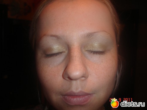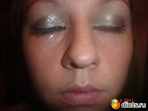 Сначала наносим на подвижное веко золотые, потом растушевываем их с белыми, затем на внешний уголок глаза наносим серые гелевые тени и на них накладываем серебренный блеск и только потом на внутренний уголок глаза накладываем блеск темнее(фото, конечно, не передает красоту этих блестящих теней, жаль). А потом я прорисовываю глазик подводкой.