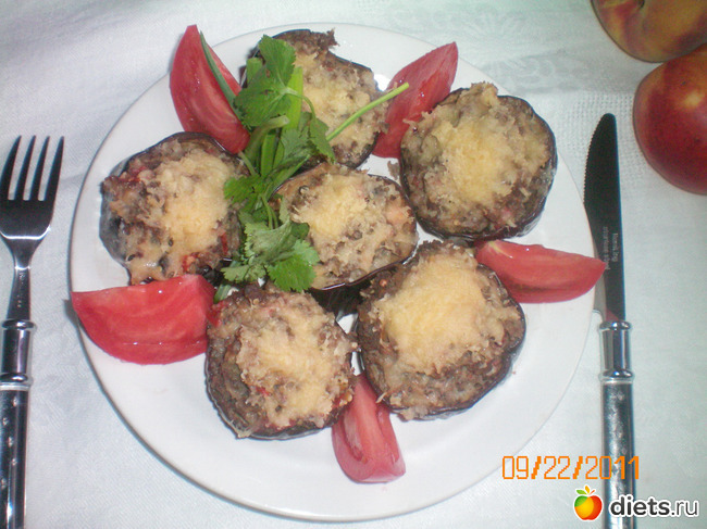 Я опять хочу поделиться с моим замечательным рецептом из баклажан. Ну, ЛЮБЛЮ Я БАКЛАЖАНЫ - вот и хочу поделиться с вами! Мужчины в моём доме как всегда любят мясцо. Но думаю, что фаршировать баклажаны можно с любыми продуктами, например:с сыром, чесноком. Просто отпад!