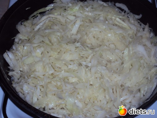 Капусту нашинковать и слегка потушить (5-7минут, до полуготовности) с добавлением растительного масла и небольшого количества воды.