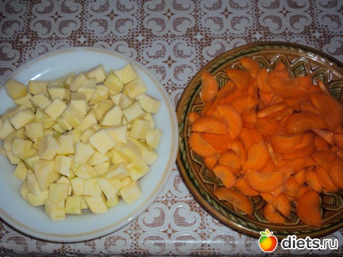 Кабачок очистить от кожуры и семян, нарезать кубиками. Морковь нарезать полукольцами.