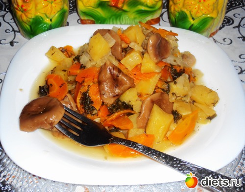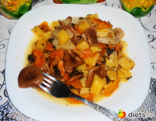 Грибы можно взять любые (можно замороженные), но на мой вкус это жаркое очень вкусно с лисичками. Я почти всегда, помимо перечисленных продуктов, готовила это жаркое с добавлением картофеля, но этот раз решила проэкспериментировать и сделать без него - получилось тоже очень вкусно, полезно, диетично и не калорийно.
