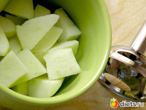 Яблоки, очищенные от кожуры и семенной коробочки, разрезать кусочками. Сбрызнуть лимонным соком, чтобы яблоки не потемнели. Пюрировать в блендере.