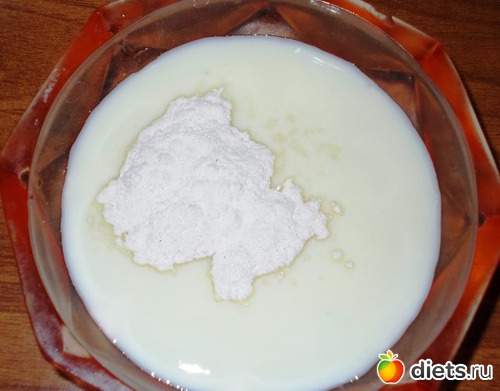 И начинаем потихоньку вводить в кефир, лучше по одной соловой ложке, тщательно перемешивая, чтобы кефир не свернулся.