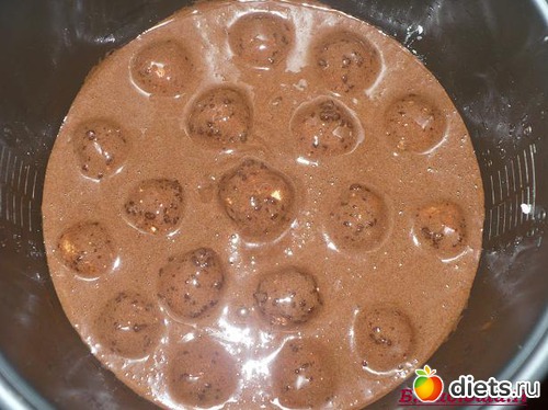 Ведёрко мультиварки смазать растительным маслом, выложить шарики и сверху залить шоколадным тестом.