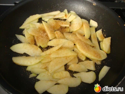 В сковороде растопить сливочное масло, добавить яблоки, оставшийся сахар, перемешать и тушить под закрытой крышкой 3 минуты.