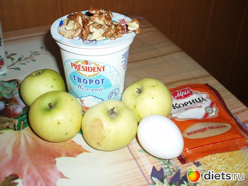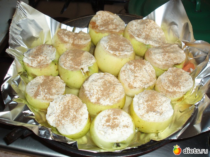 Все остальное: творог, яйцо, сахар и орехи блендером перемешиваем до однородной массы и наполняем серединки яблок. Сверху слегка притрусим корицей( сочетание яблок с корицей это божественный аромат