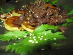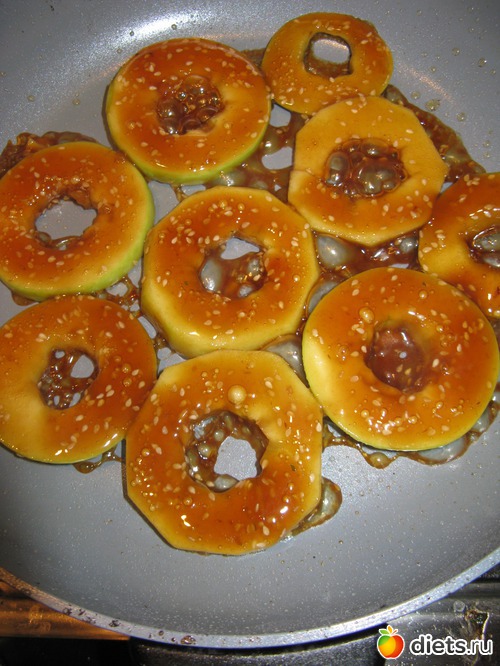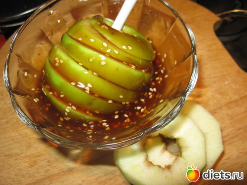 Одновременно с тушением сердечек чистим яблоки от сердцевины, режем кружочками толщиной около 7 мм, маринуем их в соусе терияки, смешанным с кунжутом в течении 10 минут.