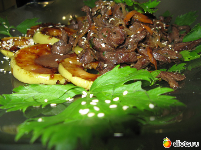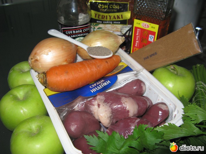 но думаю, если индейку (гуся) яблоками фаршируют, то и в качестве гарнира к сердечкам будет вкусно. Но с соусом Терияки - первый раз слышу -надо будет попробовать! Прям карамельная корочка на яблоках получается?