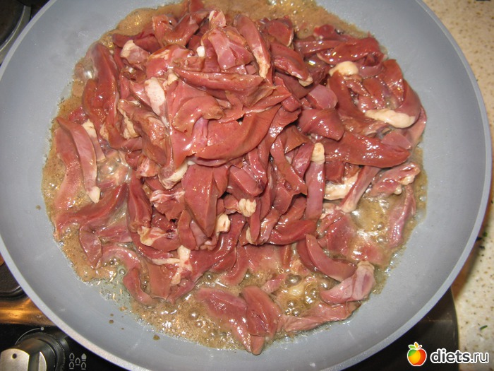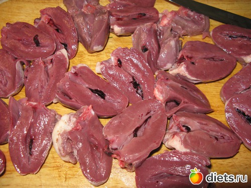 Сердечки разрезать пополам и промыть от крови, очистить от излишков жира