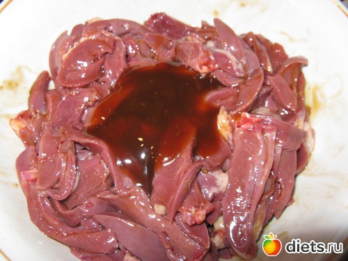 Промытые половиники сердечек порезать на 4 части. Оставить в маринаде на 1-2 часа.