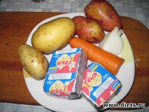 3. Положить к картофелю морковь с луком, сыр порезать кусочками и тоже кинуть в кастрюлю к картофелю. Мешать, пока сырки не разойдутся в кипятке. Посолить по вкусу. Варить в течение 30 минут.