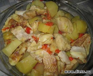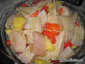 1. Филе и картофель порезать средними кусочками, лук полуколечками.