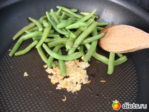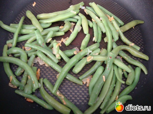Добавить фасоль, быстро размешать, чтобы фасоль покрылась маслом.