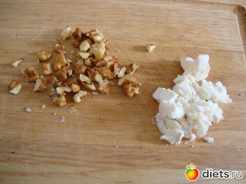Измельчить орехи и козий сыр.