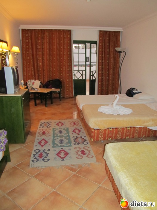 Вот наша комнатка, только это уже не в первый день. На кровати - павлин, это нам мальчик, который убирал номер, почти каждый день делал фигурки из полотенец.