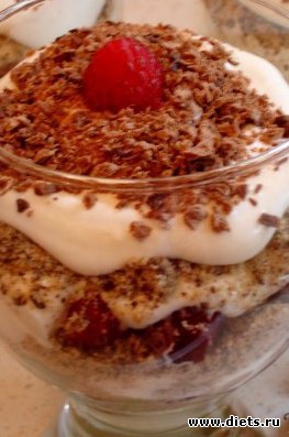 300гр малины смешать с сахарной пудрой, взбит в блендере и протереть через сито и получаем малиновое пюре. Творог не жирный протереть через сито, смешать его с йогуртом, сахарной пудрой, добавить 1/4 малинового пюре и все взбить миксером. Печенье мелко измельчить в блендере. Десерт выкладываем в бокал попеременно творожную массу, печенье и малиновое пюре и украшаем тертым шоколадом и листиками мяты. Поставить в холодильник на 30 мин. Малину можно заменить на клубнику, на красную смородину. Так же можно применять мороженные ягоды. А печенье можно заменить на орехи. Этот десерт можно делать в любое время и на любой праздник. Очень вкусно!