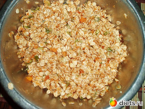 О одной миске мешать хлопья, нарубленные орешки, семечки, специи, сахар и соль.