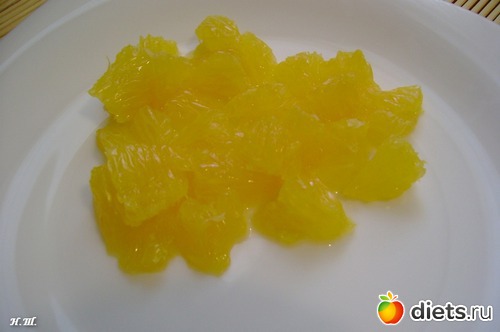 Апельсин очисть, отделить мякоть от пленок и порезать.