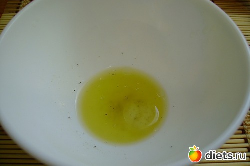 В чашке смешать сок апельсина, сок лимона, масло. Добавить соль и перец. Все перемешать.