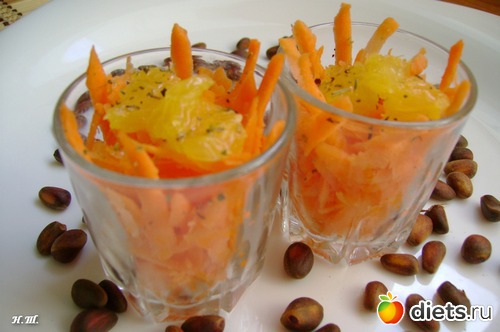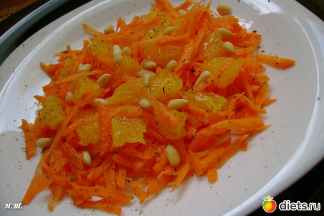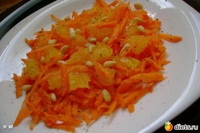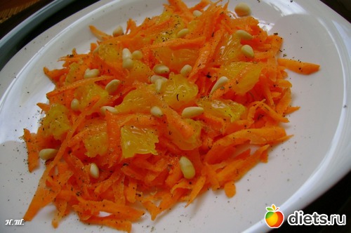 Вкусный салат из моркови, апельсина и кедровых орехов зарядит вас энергией. Морковь и апельсин- это кладесь витаминов, плюс кедровые орехи- они вызывают насыщение, подавляя аппетит, что в итоге приводит к сокращению общего количества потребляемых калорий,