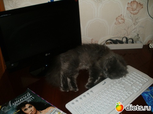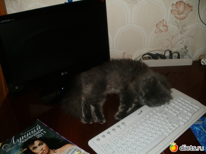 Сидя перед клавиатурой она мешает мне печатать, хотя это тоже для неё любимое занятие. Она старается так увернуться, что бы попасть под руку и её погладили. А я в это время делаю кучу ошибок, потому что мне совсем не видно букв. Если вы видите у меня ошибки, то это не я безграмотная, это Васька слишком активная.