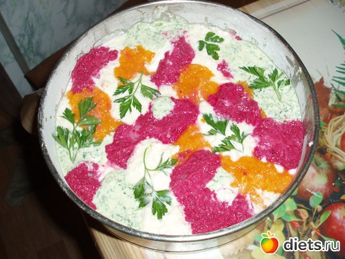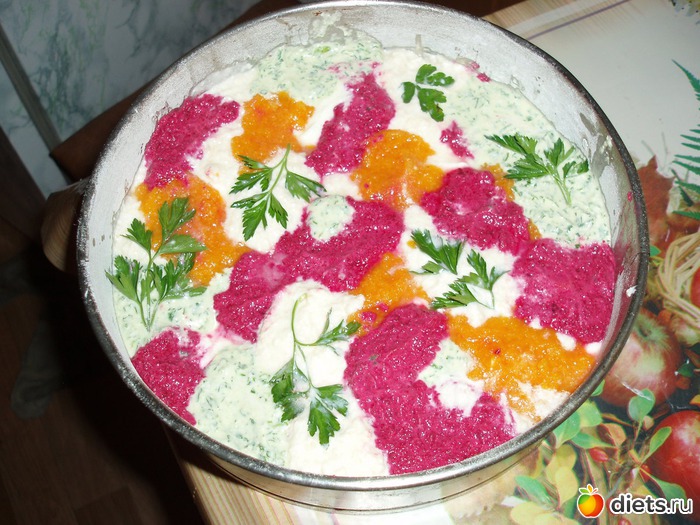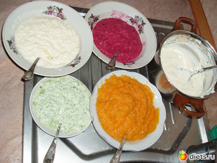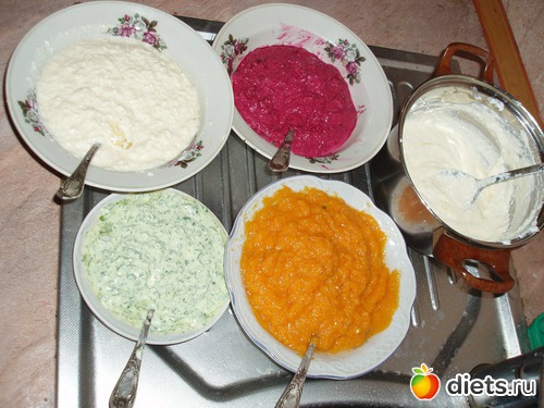 Потом я отдельно в блендере перемолола тыкву. А в свеклу добавила 3 ст л творожной массы и взбила блендером. Половину порезанных и очищенных яблок, политых лимонным соком, взбила тоже с 3 ст л творожной массы. И в измельченную зелень петрушки добавила 2 ст л творожной массы( если бы было что позеленее, то добавила бы и больше) и взбила блендером.