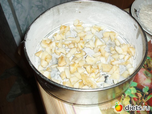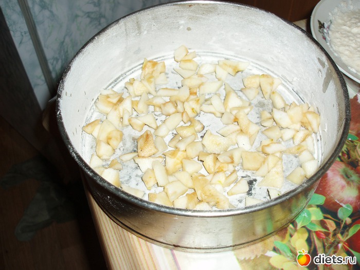 На противень смазанный маслом и присыпанный мукой( такое количество я и не считала, ну очень тонким слоем) высыпала остаток яблок