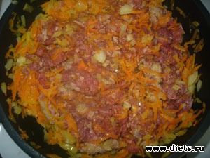 4. Добавить к зажарке фарш, посолить по вкусу и тушить все 15 минут.
