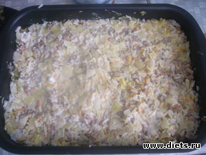 7. Смешать сметану, кетчуп, развести водой (150мл). Посолить по вкусу. И вылить в форму для запекания.