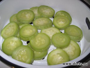 1. Кабачок порезать кружочками приготовить в пароварке (примерно 15-20 минут). Если нет пароварки можно воспользоваться "дедовским методом": на плиту кастрюльку с водой, на кострюльку дуршлаг и под крышку, такая импровизированная пароварка. Как приготовились, снять и посолить