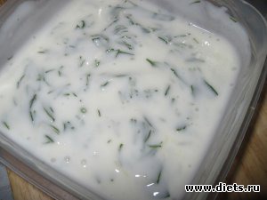 2. Делаем соус. В йогурт измельчаем зелень, чеснок и добавляем соль по вкусу. Если нет такого обезжиренного йогурта, то подойдет и 3,2%, и сметана 10-15%, только калорийность тогда будет повыше, естественно.