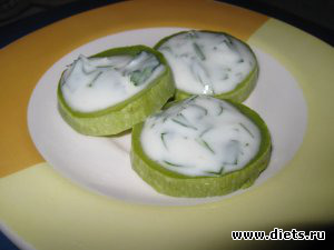 3. На каждый кружочек кабачка (лучше разогретого) выложить по ложечке соуса.