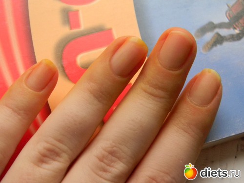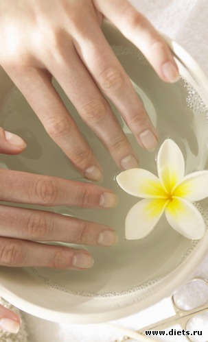 Опускаем пальчики и держим 10-15 минут. Затем для укрепления можно также смазать ногти лимонным соком, НО он очень сушит, злоупотреблять не стоит!