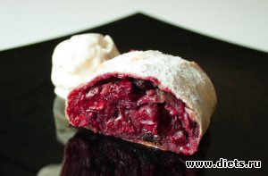 Начинаем выкладывать начинку. Сразу рассчитывайте, что по краям должны быть отступы примерно по паре сантиметров, плюс около 15 см свободного теста с края, противоположного тому, с которого вы начнете сворачивать штрудель.