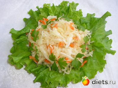Перед едой делаем из капусты салат. Для этого выложите ее в миску, добавьте нарезанный лук, клюкву или бруснику, одно мелко порезанное ароматное яблоко (без шкурки), зелень, поперчите, залейте нерафинированным маслом по вкусу.