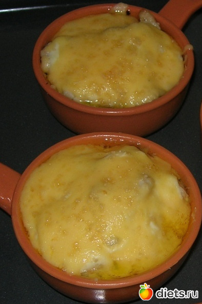 Куриное филе и лук нарезать маленькими кусочками, обжарить 5-10 мин в глубокой сковородке на большом огне постоянно помешивая. Открыть шампиньоны, жидкость слить в миску, а грибы добавляют в сковородку, огонь убавить. Жидкость смешать венчиком с мукой ( до растворения комочков) и сметаной, посолить (можно добавить немного черного перчика и сухой зелени), перемешать с куриным филе и грибами. Потушить при постоянном помешивании еще минут 5-7. Выложить в горшочки, посыпать сыром и разогреть в духовке до расплавления сыра. Можно добавить чесночку (кто так любит).
