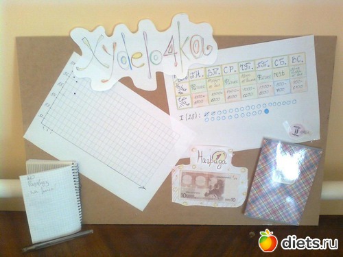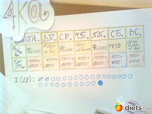 вот так вот у меня получилось..) фоткала не сегодня, там уже больше дней заполнено) 7 по-моему) да, сегодня седьмой..) но вот только отметки меня ни чуть не радуют.. сооовсем.. вес как и крутится кругом 55 так и крутится.. не знаю что делать! мало калорий - плохо, сил нет (а уж лучше на 55 буду чем истощать себя!!!), много - понятно что не хорошо, читтинг - пробовала, нет результата.. скачки калорий и т. д.. стабильность тоже.. и так уже около трех месяцев! как вот наступило плато, и все, хоть ты там тресни