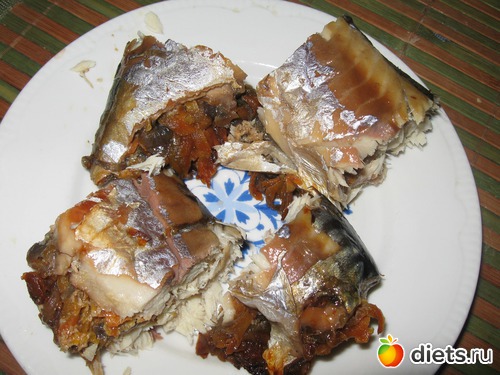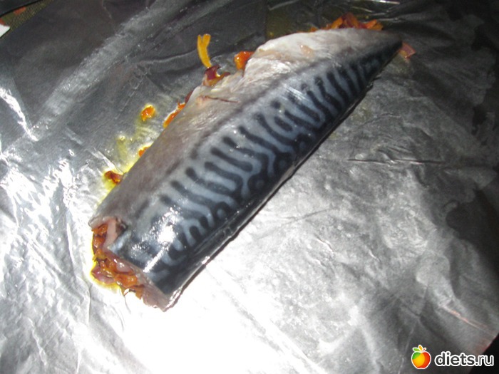Приготовила на сегодняшний обед рыбку. Танюшка раздразнила меня своими североморскими уловами, пошла в магазин и купила скумбрию. Отрезала голову, выпотрошила ее (мой кот просто урчал от наслаждения, он это дело уважает), разрезала по брюшку до спинки, но не до конца, достала косточки, присолила и немножко присыпала желатином. Одну небольшую красную луковичку порезала полукольцами, а морковочку потерла на крупной терке. Овощи пассеровала в небольшом количестве растительного масла с добавлением водички, присолила добавила паприки (я ее везде добавляю).