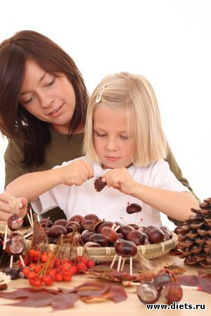 Осенняя атмосфера может царить и в квартире. Расскажите ребенку, что осенью листья осыпаются с деревьев и меняют свой цвет. Насобирайте во время короткой прогулки разноцветных листьев, шишек, желудей, каштанов, ягод рябины и шиповника — и они заменят вам игрушки на несколько вечеров. Соберите как можно больше разнообразных листьев, высушите их, и создавайте собственный гербарий! Наклейте листья в альбом, подпишите под каждым название дерева, на котором они росли.