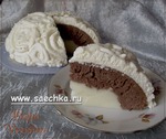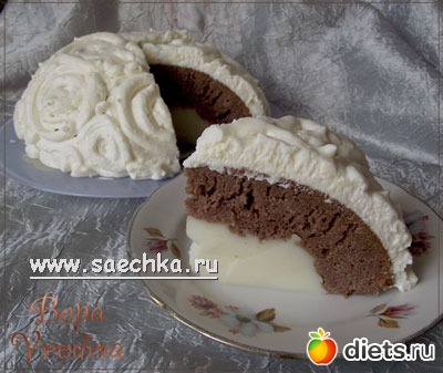Сливки взбить с сахарной пудрой (по вкусу). Вынуть десерт из холодильника, перевернуть на блюдо. Украшение блюда - взбитые сливки.