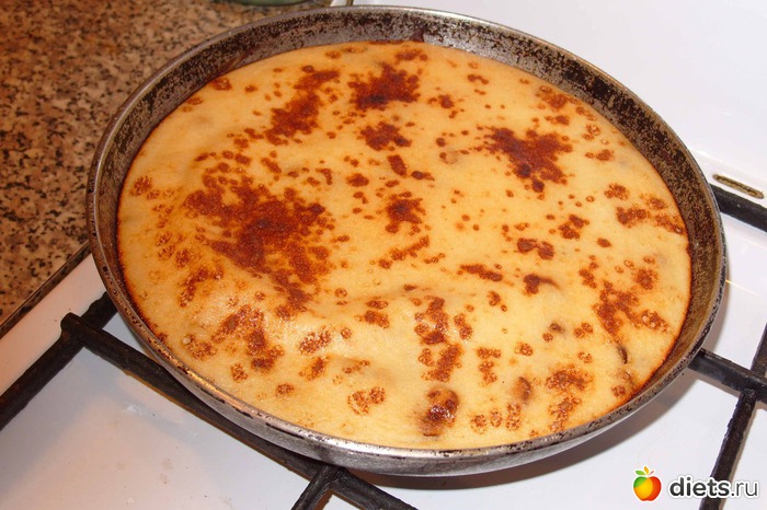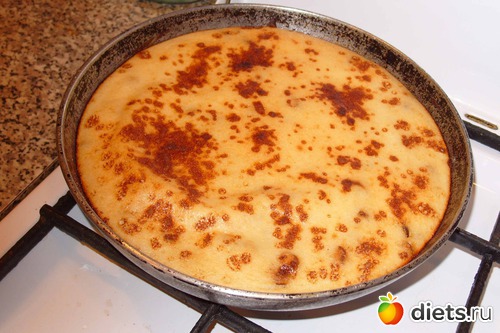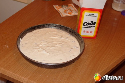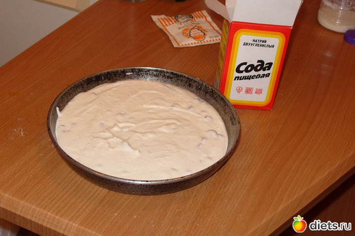 Все тщательно перемешала, выложила на сковороду и для лучего зарумянивания припорошила сверху чайной содой